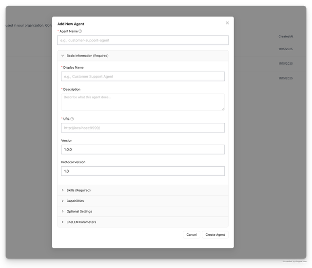 Share pre-built agents (A2A spec) across your organization. Users can discover and use agents without rebuilding them.