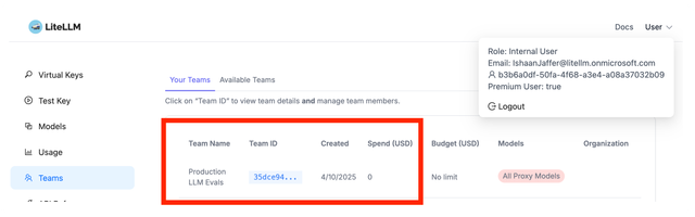 On the LiteLLM UI, Navigate to Teams, You should see the new team Production LLM Evals Group auto-created on LiteLLM.